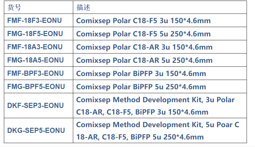 部分常用規(guī)格的單款色譜柱和方法包貨號和描述如下: