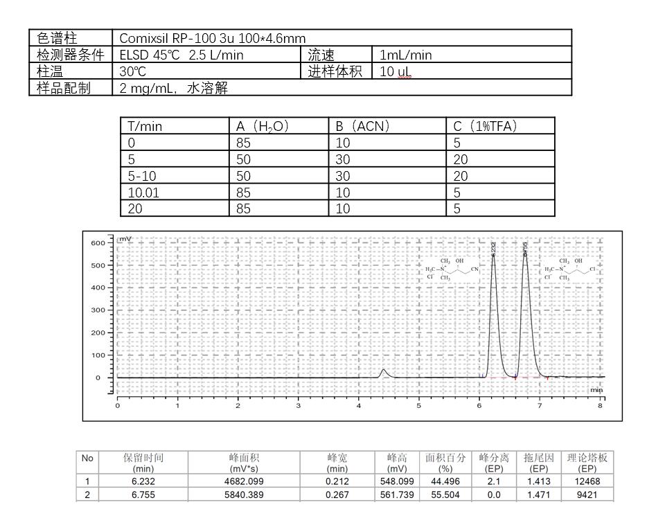 使用Comixsil RP-100色譜柱,通過陽離子離子交換和疏水作用保留和分離這兩個化合物。