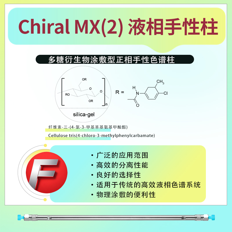 Chiral MX(2)液相手性色譜柱的固定相通常為纖維素-三-(4-氯-3-甲基苯基氨基甲酸酯)(Cellulose tris(4-chloro-3-methylphenylcarbamate))。這種固定相通過引入手性環境,使得對映異構體在色譜柱上的保留時間和分離度產生差異,從而實現光學異構體的有效分離。