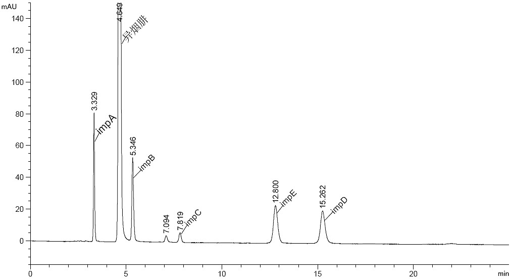 樣品:異煙肼濃度約 500μg/mL,其它雜質(zhì)濃度約 25μg/mL.